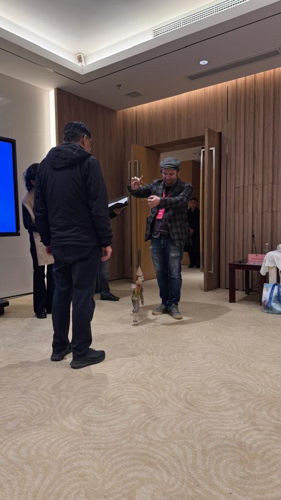 Dans le contexte de la 7ème édition du festival international de la marionnette JEM en 2024, festival que le Peruchet organise depuis 2013, et de la fête des 95 ans du théâtre et des 95 ans de l’UNIMA (Union International de la Marionnette), une délégation chinoise menée par la secrétaire générale de l’association de marionnettistes de Chine, Madame Tang Dayu, a participé lors du premier weekend d’ouverture du festival, du 17 mai au 21 mai 2024. Cette venue de la délégation chinoise s’inscrit dans une histoire plus longue. En 1986, la compagnie de marionnettes de la ville de Chengdu avait visité le Théâtre Royal du Peruchet, et la directrice de la compagnie du Théâtre National de marionnettes de Chegdu n’était autre que Madame Dayu TANG. De cette visite, une marionnette chinoise à tringle fût donnée au Musée et est toujours visible pour chaque visiteur du Musée et spectateur du théâtre. En 2012, l’actuel directeur artistique et marionnettiste se rend pour la première fois dans une réunion internationale lors du 21ème Congrès international de l’UNIMA à Chengdu. Malgré la connaissance de cette visite et d’une marionnette de Chengdu dans les collections du Musée à Bruxelles, les contacts restent difficiles. En 2021, Dimitri Jageneau, l’actuel directeur a été élu secrétaire général de l’UNIMA, organisation mondiale des arts de la marionnette. En 2023, lors du festival de Charleville-Mézières, Madame Dayu TANG et Dimitri Jageneau parlent de projets internationaux, et de la nécessité d’ouvrir plus encore l’organisation mondiale UNIMA à plus l’engagement et de participation des pays membres et des délégations des pays membres de l’organisation UNIMA. Lors de cette discussion, la photo de la marionnette donnée en 1986 au Musée International de la Marionnette est évoquée, mentionnée et montrée. Quelle n’est pas la surprise de Madame TANG de se rendre compte que le secrétaire général de l’UNIMA n’est autre que le fils du théâtre qu’elle avait visité en 1986 et auquel elle avait donné une marionnette ! Et que cette marionnette n’est pas perdue et qu’elle a toujours été présente depuis sa donation en 1986 au Musée de Bruxelles !