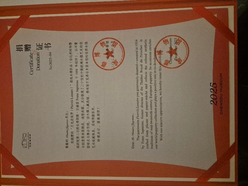 Lors de cette visite en 2024 par Madame TANG et de la délégation chinoise, le Musée reçoit une nouvelle marionnette chinoise. En guise d’amitié, le directeur Dimitri Jageneau propose de donner une marionnette du Peruchet construite en 1952 par Frans Jageneau au tout nouveau Musée de la Marionnette de Chengdu, inaugurée en 2019, dans la capitale de la Province de Sichuan, faisant suite au Congrès international de 2012. Cette marionnette Pierrôt Lunaire, exemplaire de la culture européenne et du romantisme, personnage des plus emblématiques des arts de la marionnette et souvent considéré comme double du marionnettiste, sera la première marionnette Peruchet en Chine. Un autre Pierrôt de Frans Jageneau a été donné à Maurice Béjart en guise d’amitié entre le chorégraphe et le Peruchet en 1976.